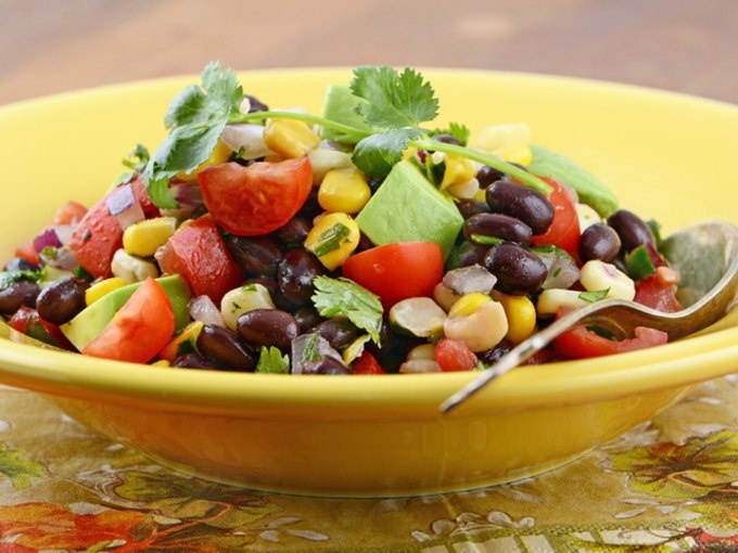 Сверху положите нарезанные пополам помидоры, а также кукурузу, фасоль и кинзу.