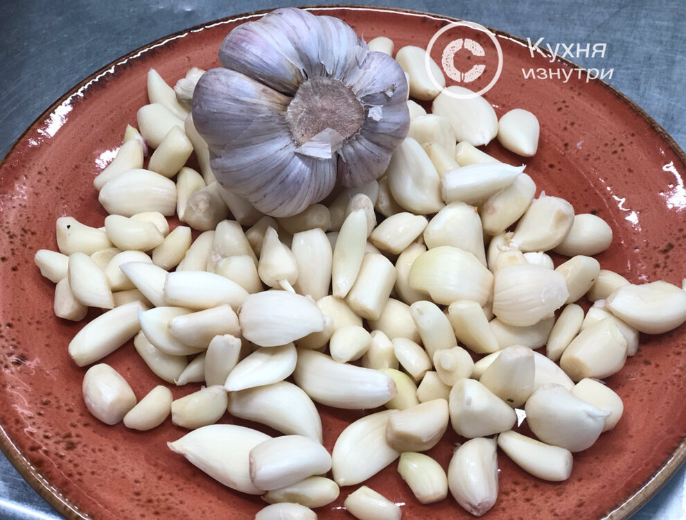 Собственно, беру очищенный чеснок. Можно сразу хоть 15 зубчиков.