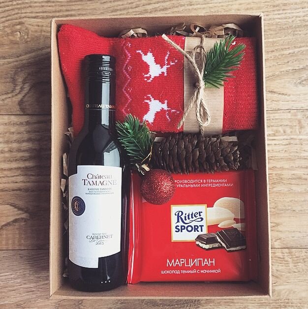 Для удобства идеи представлены в картинках, однако учтите, что содержимое боксов можно поменять: допустим шоколадку в красной обёртке можно изменить на зелёную или вовсе поменять на другой предмет, равнозначный по цене или размерам.