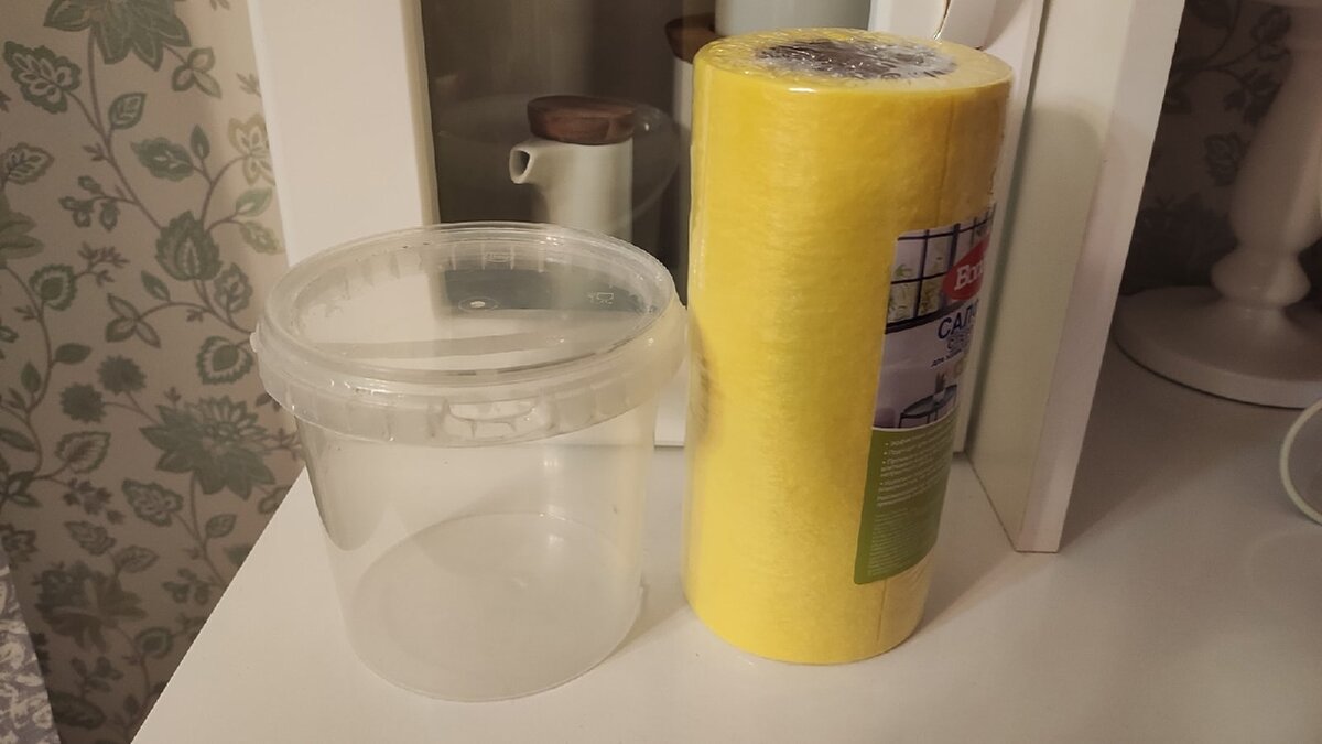 Положить полрулона в банку. Я использовала пластиковый контейнер для продуктов. В таких продаются морская капуста, морковь по-корейски…