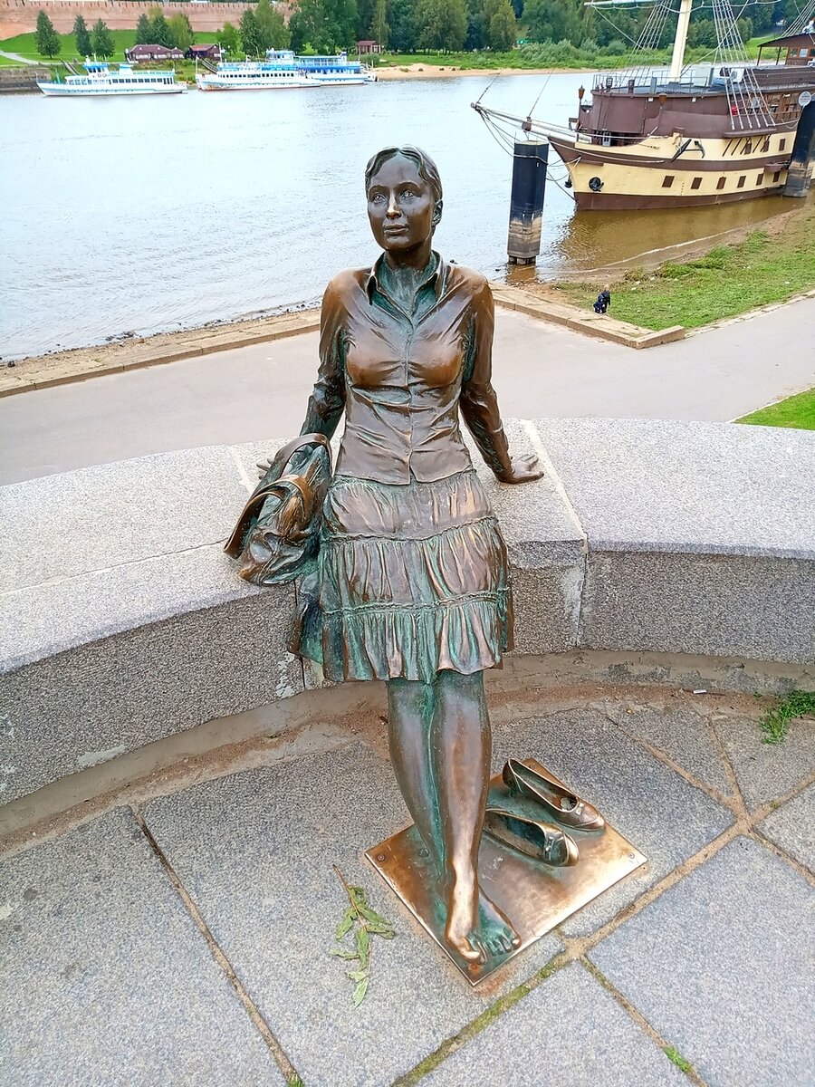 Прогуляемся по другому берегу Волхова - по Торговой стороне Великого Новгорода. И на противоположном конце Кремлевского моста нас встречает памятник уставшей туристке.