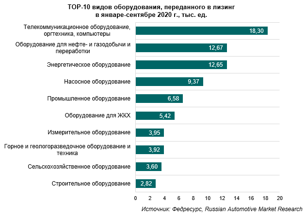 Наибольшим спросом в финансовом лизинге пользуется телекоммуникационное оборудование, оргтехника, компьютеры. За девять месяцев 2020 года в лизинг оформлено 18,3 тыс. ед. данного оборудования.