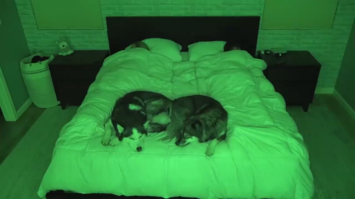 На нем видно, что собаки первыми занимают место на кровати еще до того, как придут хозяева. Питомцы прекрасно знают, что пора спать. Их не нужно приглашать, собаки уже там, ожидая опекунов. Когда пара ложится спать и накрывается одеялами, хаски сразу же приходит к ним. Поцелуй на ночь? Собаки, кажется, ждут, когда их пригласят под одеяло, однако хозяева на это не соглашаются. Кроме того, хаски любят холод, так что под одеялом им может быть слишком тепло.