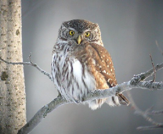 Стайка из синичек и корольков с поползнями перепархивала от дерева к дереву в поисках корма. Несколько синичек устремились к пихте, на которой сидел сычик.