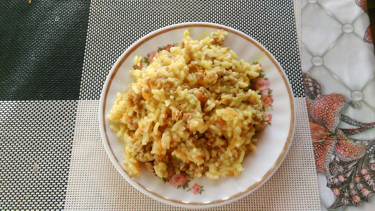 Кладем на разогретую сковороду с подсолнечным маслом фарш, добавляем соль и перец, перемешиваем и обжариваем на среднем огне до полу готовности фарш, затем бросаем лук и чеснок,перемешиваем и также обжариваем до полу готовности, затем бросаем морковь и опять все перемешиваем жарим морковь до готовности, затем добавляем рис и жарим еще пару минут постоянно помешивая, вливаем воду (вода должна покрыть рис примерно на 1,5-2 см). Доводим до кипения убавляем огонь до минимума накрываем крышкой и томим минут 35-40 до готовности риса.