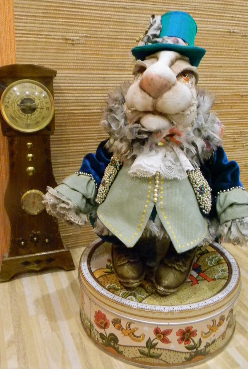 А это мой Белый Кролик из Алисы в Стране Чудес. Это моя первая игрушка, сделанная в технике грунтованный текстиль. Кролик долго не хотел одеваться, выбирал одежду=) Но потом всё-таки согласился на бархатный камзол сине-бирюзового оттенка, расшитый жемчужными бусинками, манжеты из льняного кружева с серебристой ниточкой, рубашку и жабо из испанской натуральной шелково-хлопковой ткани с принтом