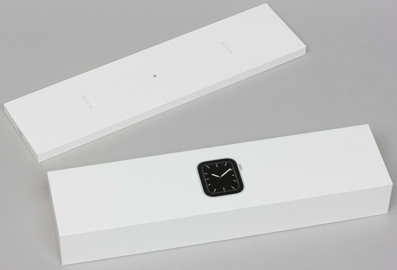Упаковка Apple Watch Series 5 ничем не отличается у таковой у модели прошлого поколения. Опять мы видим ремешок в отдельном боксе, тогда как в основной коробке хранятся сами часы, зарядное устройство и листовки.