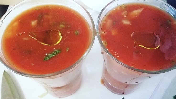 Порубить семена тыквы, добавить их в стаканы, затем подавать диетический томатный коктейль к столу вместо еды.