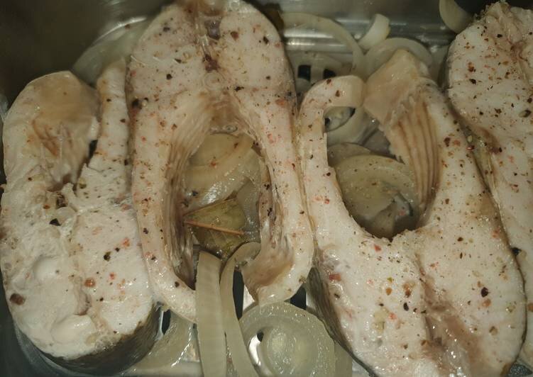 Нашинкуйте лук тонкими полукольцами. Положите муксуна в пароварку, накройте луком, посолите, поперчите. Готовьте 40 минут.