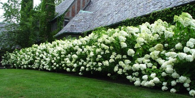 Гортензия. Цветет очень красиво, большими соцветиями, цвета самые разнообразные – белый, розовый, красный, голубой, фиолетовый. Уже за один сезон вырастают достаточными, чтобы закрыть участок.