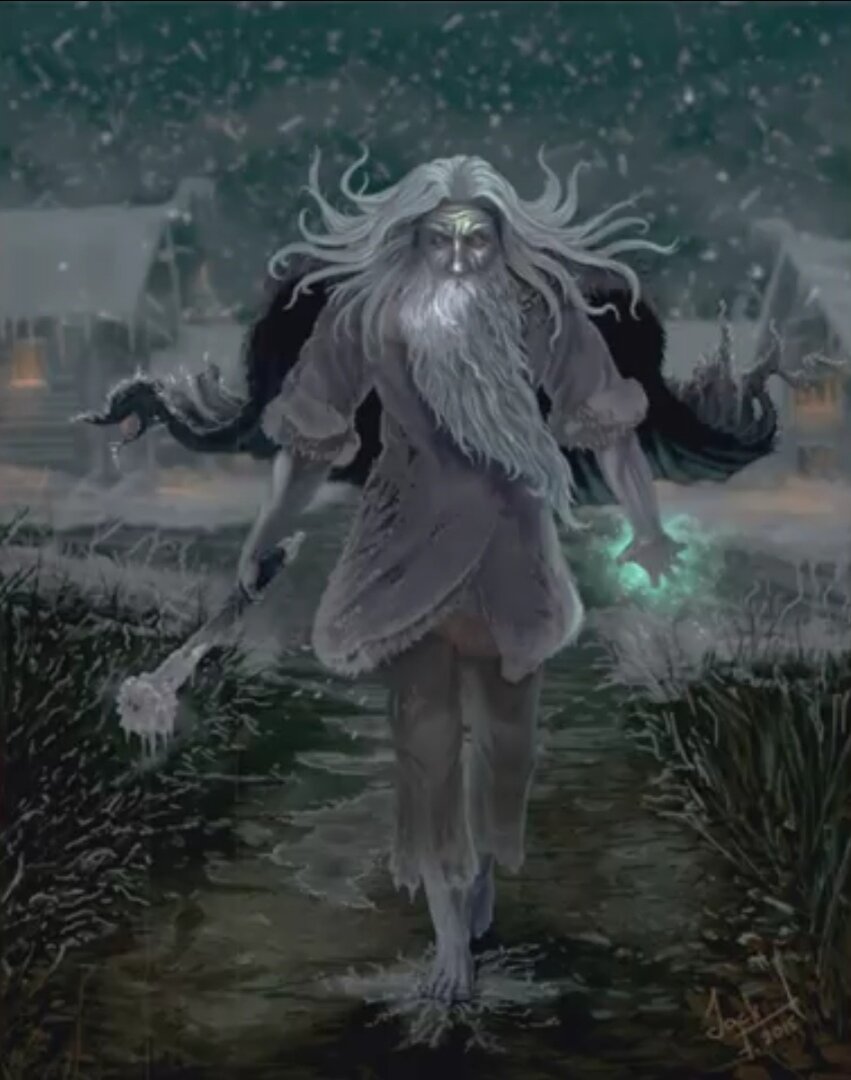 Морозко, Морозец, Студенец. Этот древний дух убивал всё живое , что могло стать на его пути. Одним ударом посоха он замораживал деревья и реки, при встрече человека, который не успел вернуться из лесу до наступления темноты. Морозко оставлял в живых лишь тех, кто относился к нему с почтением. Это поверье было распространено среди румын и славянских народов.