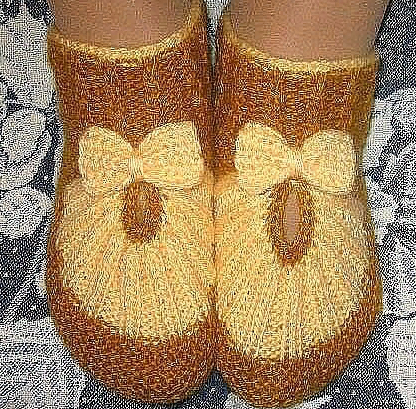 После подшиваем зубцы спицой. Переходим на подошву которую вяжем вторым цветом платочной вязкой когда начинаешь вязать подошву. нужно убавлять в каждом втором ряду первые две петли вместе..потом две вместе перед центральной петлёй..провязываем центральную петлю и опять две вместе и две последние вместе Набрать на спицы 51 петлю тёмной нитью, провязать 8 рядов платочной вязкой. Затем разделить все петли на три части: 17+17+17, и вязать только среднюю часть. Боковые петли временно снимаем на большие булавки. Среднюю часть можно украсить любым рисунком. Например "бабочки".