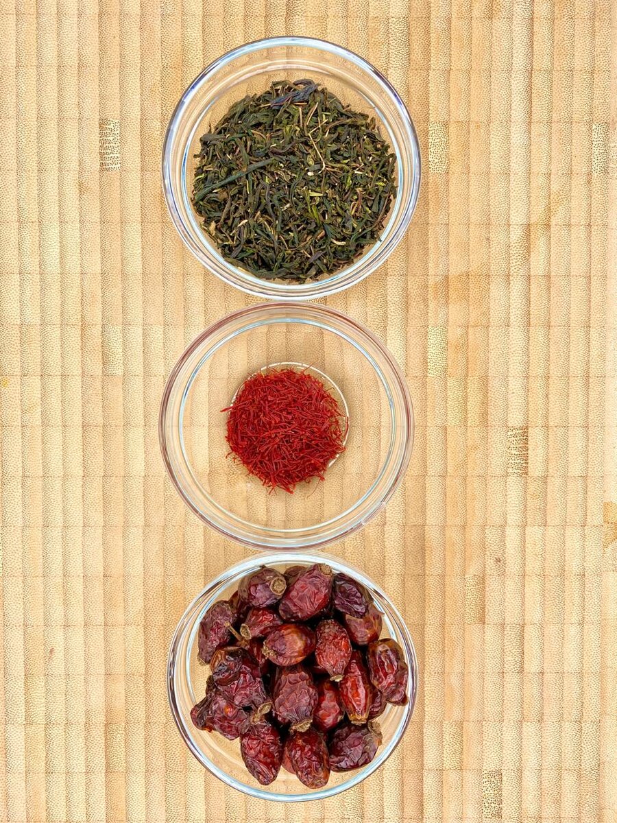 Основные ингредиенты - это ферментированный иван-чай, перемолотый шиповник и крошечная щепотка настоящего шафрана!