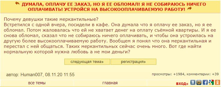 Лейтмотив женских форумов - баба только за деньги спит, а иначе дрочи.
