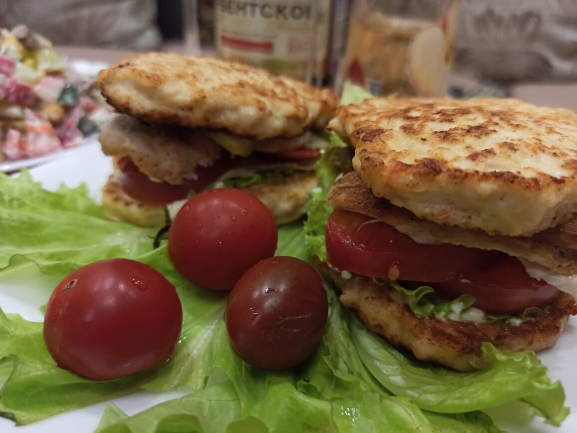 Вообще-то, бургеры не так уж и вредны. Вернее, начинка не вредна - вредна калорийная булка((((. Но сегодня мы сделаем домашний бургер без булок - очень сытный, вкусный и красивый и идеально подходящий для диеты и ПП "Мясо с мясом" - скажете вы. Ну и что? Такая еда получается очень сочной, сытной и диетичной. НАДО: Для основы: -куриное филе - 400 гр -лук репчатый - 1 шт -3 ст ложки муки -2 яйца -3 ст ложки сметаны или густого кефира -соль и специи -масло для обжаривания. Для начинки: -лист салата -помидор -сыр -огурчик ( у меня соленый) -мясо или ветчина ( мы делали куриный шашлык. поэтому в моем бургере шашлык из грудки) -немножко сметаны и горчица для соуса. ДЕЛАЕМ: 1. Филе проворачиваем на мясорубке вместе с луком. 2. Добавляем 2 яйца. муку и сметану. Солим. Как следует вымешиваем. Фарш должен получиться чуть жидковатым. 2. На разогретой сковороде жарим котлетки. Стараемся придать им плоскую круглую форму. Обжариваем с двух сторон. 3. Готовим начинку. Моем лист салата, а остальные и