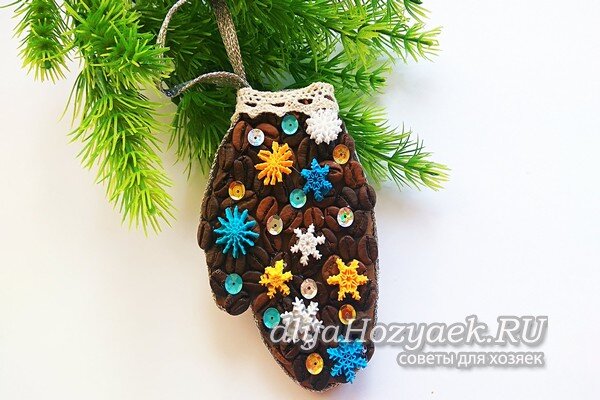 Представленная елочная игрушка выполнена в виде варежки, декорирована зернами кофе, пайетками и снежинками. Также вы можете декорировать ее ягодками калины, маленькими цветочками, веточками ели.