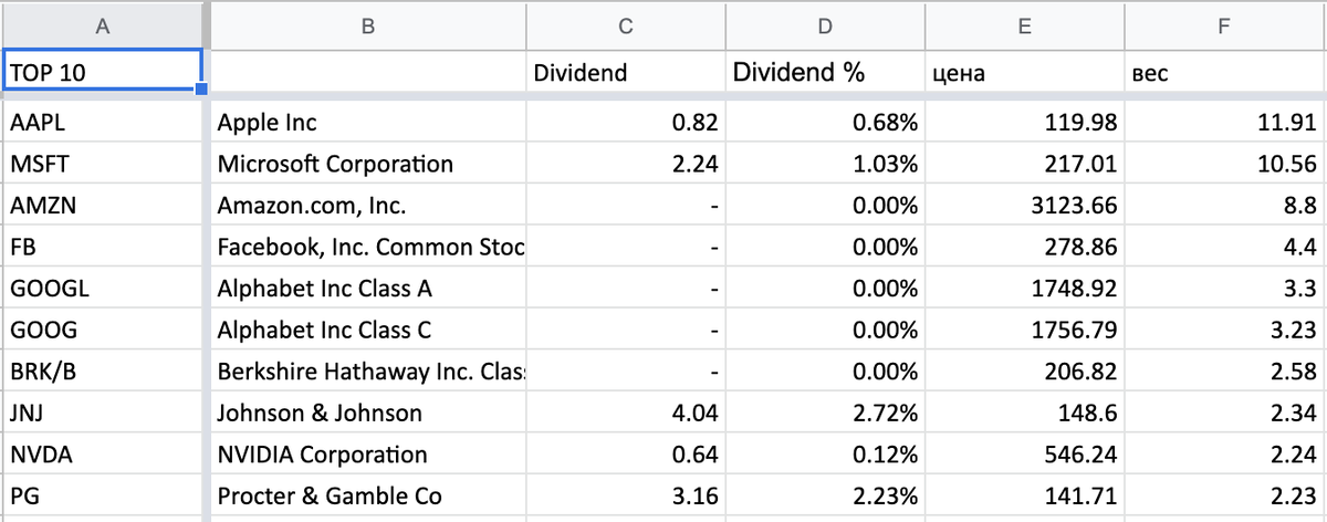 Для примера я взяла ТОП-10 американских компаний из состава фонда Invesco S&P 500® Top 50 ETF #XLG, который следует индексу S&P500.