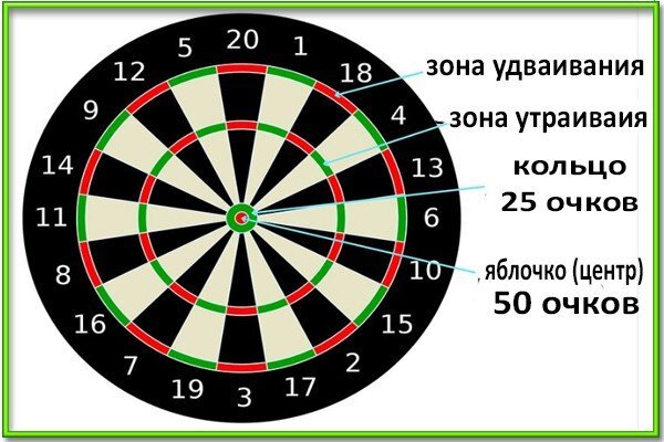 - За попадание в зону удваивания или утраивания- очки данного сектора удваиваются или утраиваются соответственно.