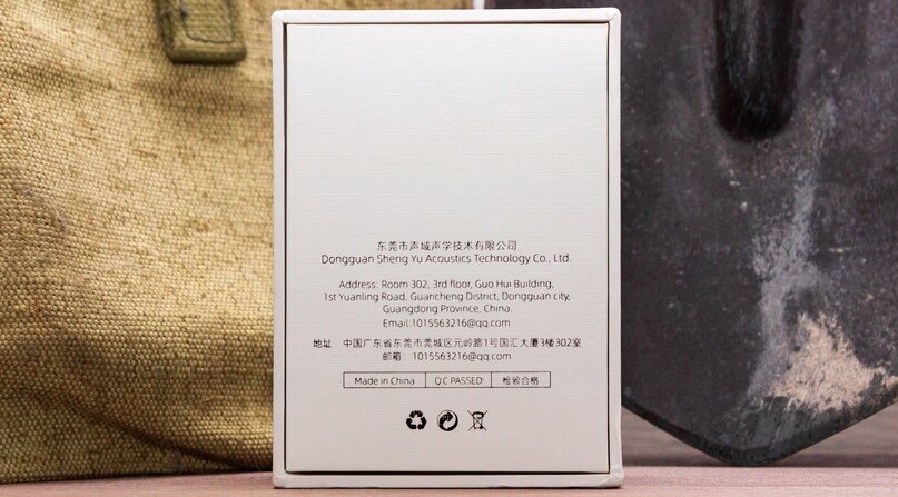 На лицевой стороне размещён логотип, на правом боку — наклейка с указанием характеристик на английском и китайском языках, а также два поля с пометкой о том, есть ли на проводе микрофон.