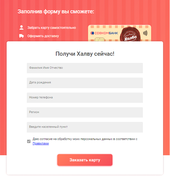 ⦁ Для начала заполняем заявку на получение дебетовой карты “Халва”. Ссылку обязательно копируйте и вставляйте.