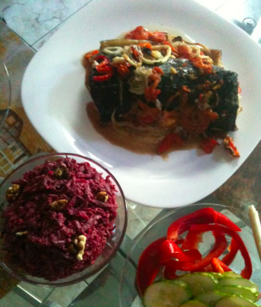 осетр - 1 кг соль, перец - по вкусу лук - 1 шт. чеснок - 3 дольки помидоры - 1 шт. перец болгарский - 1 шт. укроп - 3 ст. ложки лавровый лист фольга для запекания