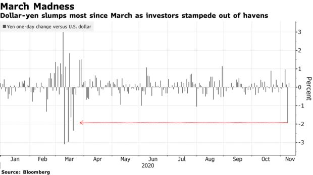 Новости о том, что вакцина, разработанная Pfizer Inc. и BioNTech SE, более чем на 90% эффективна в предотвращении заражения Covid-19, вызвали в понедельник поток ставок на акции, такие как круизные операторы и авиакомпании, которые страдали во время пандемии. Такие убежища, как казначейские облигации, золото и иена, упали.