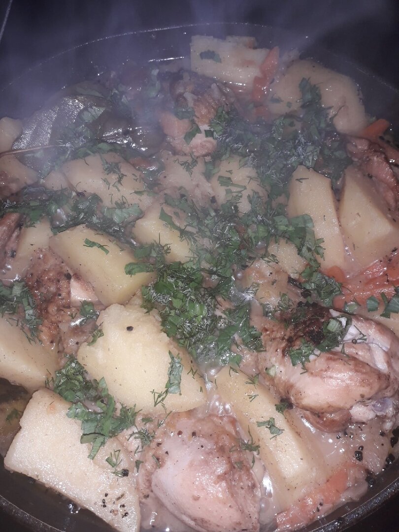 Накрываем эту красоту крышкой и на медленном огне оставляем томится. Тут конечно чем дольше, тем вкуснее и нежнее получится жаркое, минимальное время час, оптимально полтора. Добавляем мелко нарезанную зелень (я использую укроп и петрушку, можно любую другую на ваш вкус). Выключаем и даем минут 5 постоять. Супер вкусное жаркое готово.
