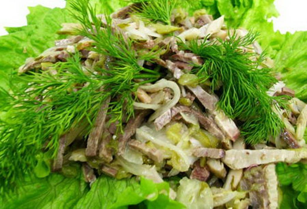 Есть и еще более простой вариант: купить язык готовым, а капусту замороженной. Но у меня такой салат получается каким-то угрюмым и совсем не радует. Короче, пародия, а не салат!