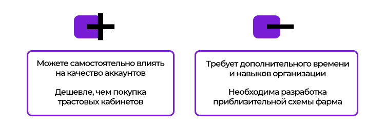 Стабильный вариант, который требует вложения сил, но обеспечит поток качественных аккаунтов. Необходима разработка собственной методики фарма, так как все продаваемые в интернете схемы являются копией друг друга и быстро устаревают.