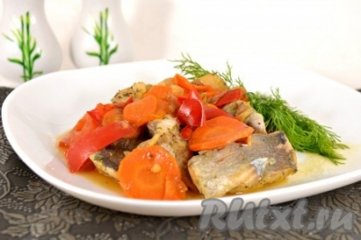 бульон овощной или рыбный (или вода) - 100 мл. Филе хека разморозить, обсушить бумажными полотенцами. Нарезать филе средними кусочками, посолить, посыпать специями. Лук репчатый нарезать полукольцами, морковь - тонкими кружочками. Сковороду разогреть с растительным маслом и обжарить лук с морковью в течение 3-4 минут, помешивая. Добавить в сковороду нарезанный соломкой болгарский сладкий перец, чуть посолить, обжарив