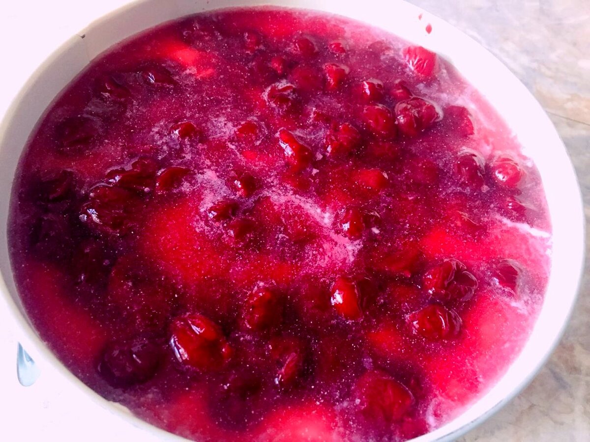 6. Массу выкладываем в форму и сверху накрываем вишней и заливаем оставшимся желатином.