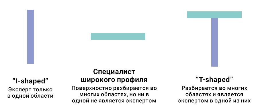 Попадаются же люди, которые дотянули себя не только до уровня экспертности в одной сфере деятельности, но и "прокачались" в смежных областях. Таких людей называют T-Shapped (Т-образными). Они стали специалистами в определенной области, но могут успешно работать и с экспертами в соседних областях деятельности, понимая и их проблематику.