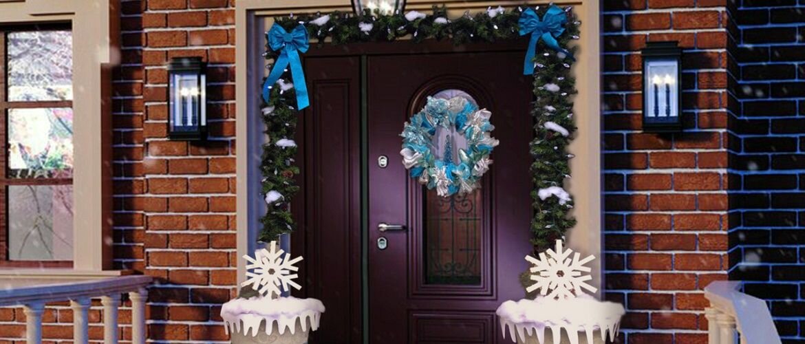 Дополните такую композицию декором вокруг двери, установите на входе сани Деда мороза, символ Нового года или красивые рождественские букеты.