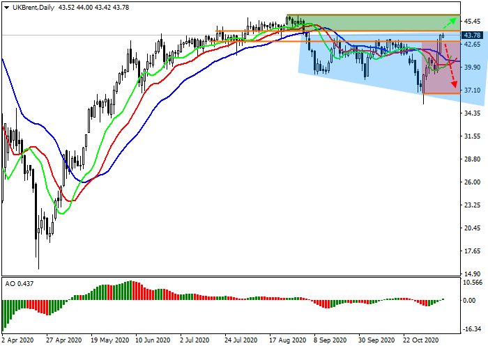 Таким образом, Аналитика и прогноз цен на нефть на 12 - 13 ноября 2020 предполагает в случае продолжения роста актива, а также закрепления цены выше уровня локального сопротивления на отметке 44.40 будут актуальны позиции на покупку с целью 46.10. Стоп-лосс следует установить на отметке 43.80, ниже уровня поддержки. Срок реализации: 4 дня.