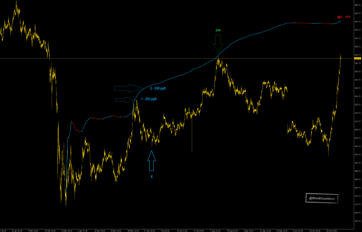 Постановка целей в торговле на бирже - стандартное и, наверное, правильное дело. Только все постоянно забывают, что рынок никому ничего никогда не должен. А ведь как обычно происходит? Купят бумажку и запишут себе в тетрадку - вот на 139,54 я продам с профитом. Откуда взялась эта магическая цифра? Фактически - ниоткуда. Но гражданин её себе всегда объяснит. Это будет какой-то экстремум в прошлом. Или наделенные "волшебной" силой уровни расширений Фибоначчи. Представим, что мы поймали лой отката на Сбербанке и купили в точке Х. Одна из очевидных для многих целей - это уровень 223 рублей, где был предыдущий хай. И цена, надо отдать должное, дошла до туда. Но сколько бы мы еще кусали дальше локти в страданиях по упущенной прибыли? Мы давно уже используем для себя цели динамические. Динамика - это природа рынка. Ведь рынок - это динамическая система. И цели на рынке меняются в динамике. Синяя (в своей основе) линия - это наша динамическая цель. К ней стремится цена. В момент покупки динами