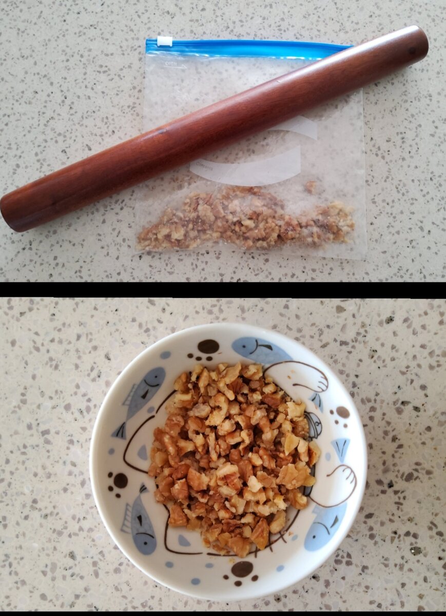 1. Грецкие орехи, помыть, обсушить, слегка прогреть на сковороде, или в микроволновой печи. Размять, можно положить в пакет и постучать скалкой. Без фанатизма, толочь в муку не надо.