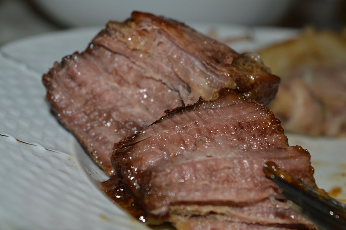 На рынке часто попадается отруб, который называется "толстый край". Он не самый дорогой, у нас на рынке стоит 525 рублей. Этот кусок нужно уметь готовить. Если срезать кости, получается очень много отходов. Конечно, из толстого края делают премиальный стейк рибай, но и цена такого стейка космическая. Поэтому я предлагаю его не разделывать, а приготовить целиком методом медленного запекания. Сначала немного замаринуем кусок. Я добавляю специи для мяса, соль, перец и оливковое масло. Совсем не много. Даю мясу постоять около двух часов. Кладу мясо в форму, выливаем в нее стакан воды. Желательно, чтобы форма была не много больше куска мяса. Закрываем сверху фольгой, края заправляем внутрь формы, иначе конденсат будет течь по форме в духовку. Доводим температуру в духовке до 200 градусов, держим 10 минут. Снижаем до 100 градусов и держим при такой температуре 90 минут. Получается очень мягкое " губами можно есть" мясо, разваливающееся на волокна. В меру жирное и очень вкусное. И отходов