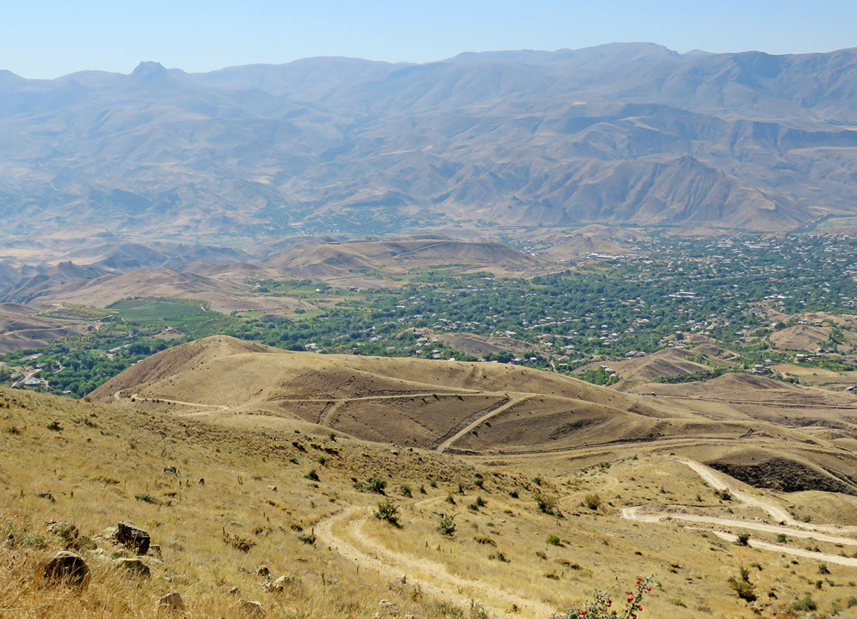 Стоило ли выкладывать 1500 рублей за такси к очередному армянскому монастырю - я совсем не был уверен, но сомнения отпустили, стоило было вскарабкаться чуть наверх по ухабам. Вот он, Вайоц-Дзор, древняя Долина Плача, по преданию названная так после Мозского землетрясения в 735 году. По дну зелёной лентой спускаются Вершнашен, Гладзор и Ехегнадзор, где-то там дальше Гетап и наш кемпинг, а на заднем плане высокая стена хребта, отделяющего Вайоц-Дзор от Сюника (Зангезура) и Нахичевани: