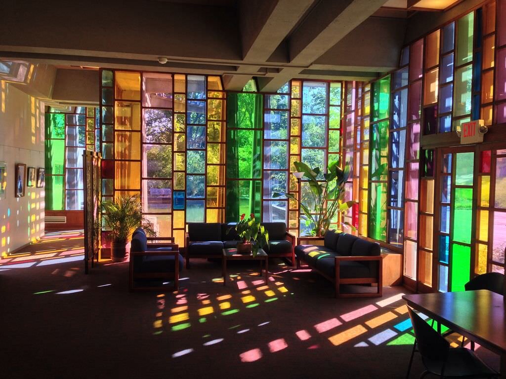 Дом собраний, расположенный у подножия крутого склона, представляет собой сложную сеть перекрывающихся деревянных и бетонных структурных элементов, построен в 1964 году. Цветные стеклянные стены создают хриплую симфонию света внутри вестибюля. В пинакле есть световой люк, освещающий элегантно скромный конференц-зал внизу.