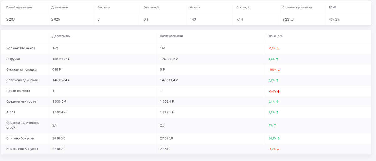- ARPU — сколько в среднем выручки принес гость, откликнувшись на рассылку.