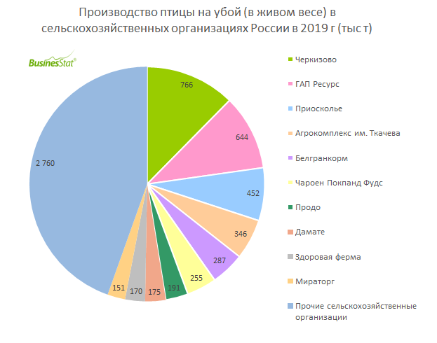 По оценкам BusinesStat, в 2019 г на десятку лидеров по производству мяса птицы приходилось 3 436 тыс т