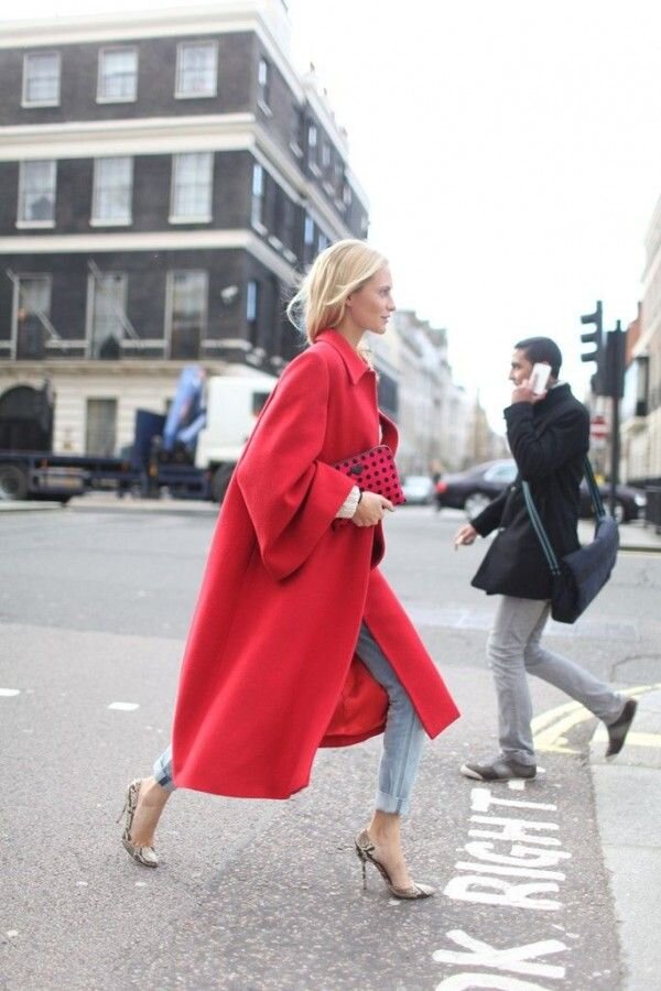 Почему бы не добавить красок в серые будни? Красное пальто отлично справиться с этой задачей! Уверена, что в таком образы все восхищенные взгляды будут вашими.