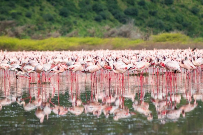 В осенний сезон дождей фламинго любят воды расположенного неподалеку кенийского озера Накуру, но в более засушливые месяцы они перемещаются в Богорию. Здесь розовую сказку можно увидеть круглый год. На озере птицы гнездятся и выводят птенцов. Число фламинго в Богории порой достигает полутора-двух миллионов!озовая сказка.
