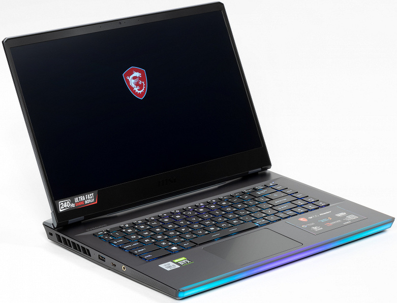 MSI GE66 Raider 10SGS-062RUПроцессорIntel Core i9-10980HK (8 ядер/16 потоков, 2,4/5,3 ГГц, TDP 45—65 Вт)ЧипсетIntel HM470Оперативная память32 ГБ (2×16 ГБ) DDR4-2666ВидеоподсистемаNvidia GeForce RTX 2080 Super Max-Q (8 ГБ GDDR6)Дисплей15,6 дюйма, 1920×1080, 240 Гц, IPS, полуматовыйЗвуковая подсистемакодек Realtek ALC298, 2 динамикаНакопители1 × SSD 1 ТБ (WD PC SN730, M.2, NVMe)Оптический приводнетКартоводSD / SDHC / SDXCСетевые интерфейсыПроводная сетьGigabit Ethernet (Killer 3100)Беспроводная сетьWi-Fi 6 (802.11ax, Killer 1650i)Bluetooth5.1Интерфейсы и портыUSB2 USB 3.0 Type-A, 1 USB 3.1 Type-A, 1 USB 3.1 Type-C (с поддержкой DP), 1 USB 3.2 Type-C (USB 3.2 Gen2×2)Видеовыходы1 HDMI 2.0 (4K@60 Гц), 1 Mini-DisplayPort, 1 USB Type-C (DisplayPort)RJ-45естьАудиоразъемыкомбинированный выход на наушники и микрофонный вход для гарнитурыУстройства вводаКлавиатураSteelSeries, короткий ход, индивидуальная RGB-подсветка каждой кнопкиТачпадестьIP-телефонияВеб-камера1080p@30 fpsМикрофонестьАккумуляторлитий-полимерный, 4 ячейки, 99,9 Вт·чАдаптер питания230 Вт, 735 г, кабели на 1,8+1,7 мГабариты358×267×23,4 ммМасса без адаптера питания2,38 кг (по нашим измерениям, 2,43 кг)Операционная системаWindows 10 ДомашняяГарантия2 года