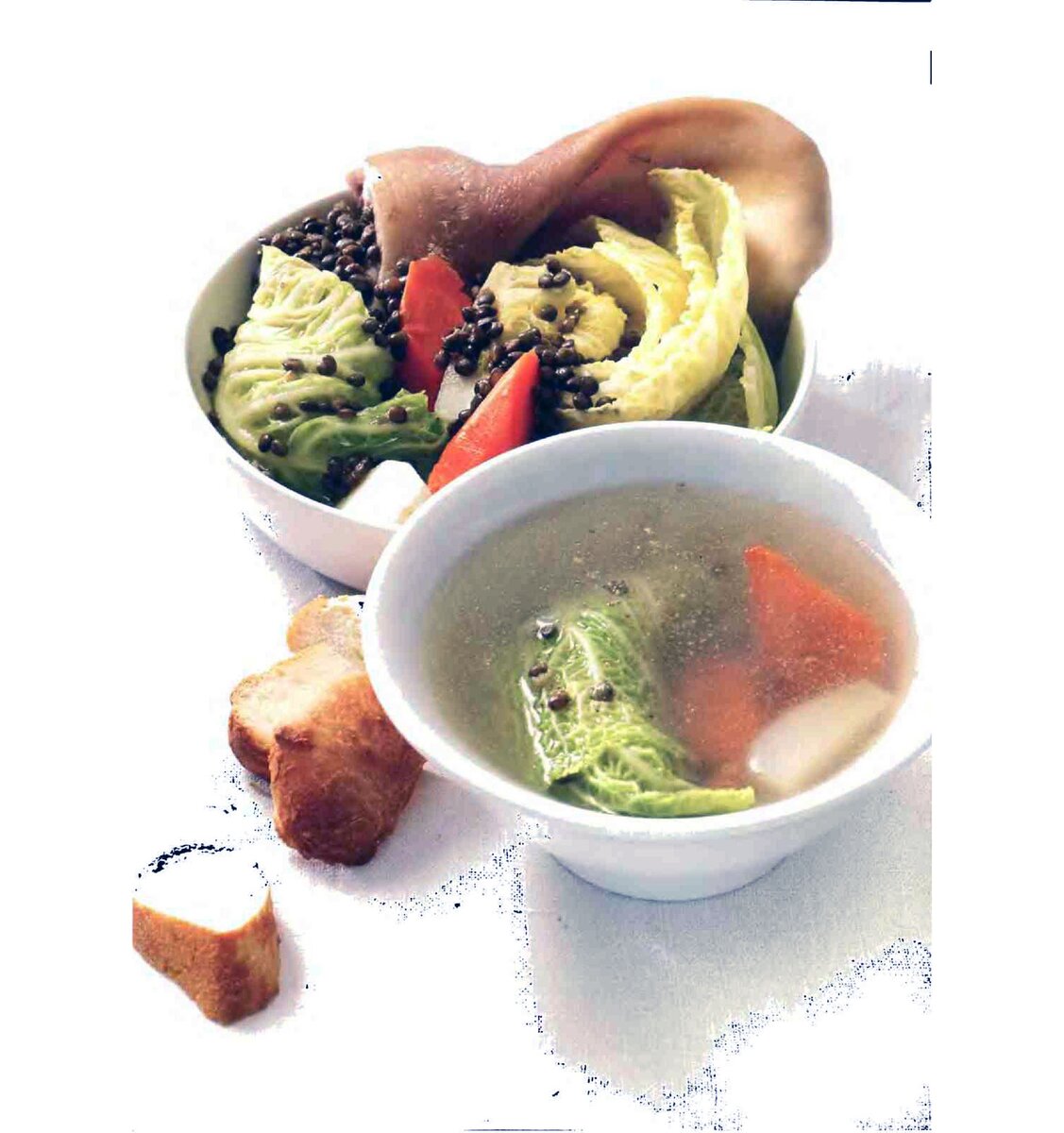 Перед подачей вылейте бульон в супницу, предварительно положив в нее ломтики деревенского хлеба. Свиную голову и овощи разложим на