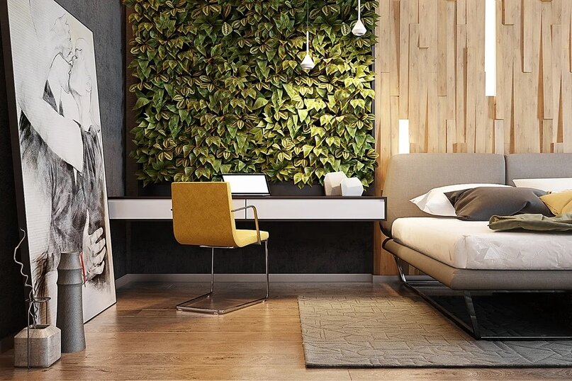 · Для отделки стен обычно используют дерево и пробку, бумажные обои с изображением растительных мотивов, гипоаллергенную штукатурку, эко-краску. Интересным решением станет фитостена с натуральной зеленью, оснащенная автоматической системой полива.
