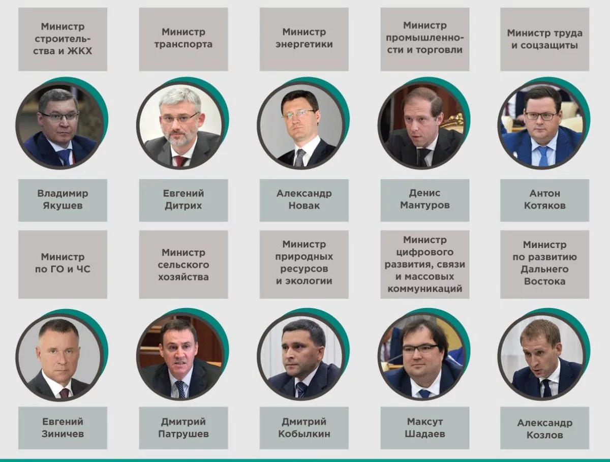 На пост главы Министерства транспорта предложили экс-главу «Аэрофлота» Виталий Савельев, Министерства строительства — бывший заместиетль министра Ирек Файзуллин, Министерства природы — экс-глава Министерства по развитию Дальнего Востока и Арктики Александр Козлов, Министерства энергитики — глава «РусГидро» Николай Шульгинов.