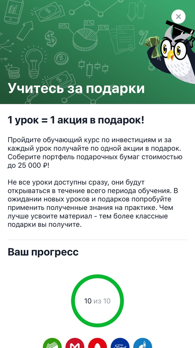 Так вот суть этой акции, нужно было открыть брокерский счет в Тинькоф и получить дебетовую карту, ни за что платить не нужно! За дебетовую карту нужно платить месячное обслуживание, но я его отключил, поэтому ни капли не потратил денег на все это. После этого нужно зайти в приложение тинькоф инвестиции и пройти там обучение из 10 уроков 👇
