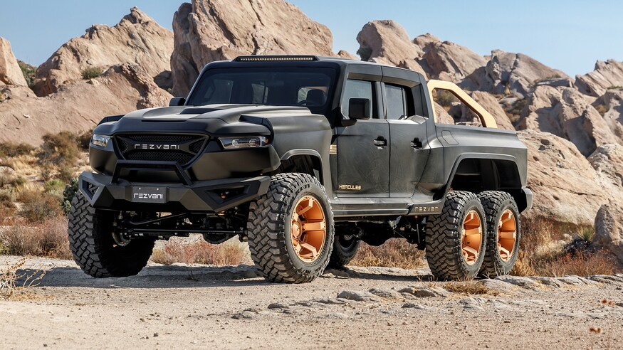 Если вы внимательно посмотрите на сверхдорогую индустрию пользовательских грузовиков, вы заметите несколько тенденций. Во-первых, деньги не всегда покупают вкус, а во-вторых, заказные строители грузовиков просто не могут перестать делать шестиколесные монстры-пикапы с неприличным количеством мощности. Южнокалифорнийский Резвани запрыгнул на двойную заднюю ось с готовым к апокалипсису Hercules 6x6.Продолжая то, на чем остановился почти безумный танковый внедорожник Rezvani, Hercules 6x6 добавляет кузов грузовика, 1300-сильный наддув 7,0-литрового V-8 на базе двигателя Dodge Challenger SRT Demon crate и, самое главное, еще одну пару колес и шестиступенчатый привод по требованию. Поскольку танк Резвани-это изготовленный на заказ, сильно модифицированный Jeep Wrangler, вероятно, можно с уверенностью предположить, что Hercules начинает свою жизнь как пикап Jeep Gladiator. Но помимо того, что он делит свою базовую платформу с грузовиком-джипом, Резванский Геркулес-это совсем другое животное.