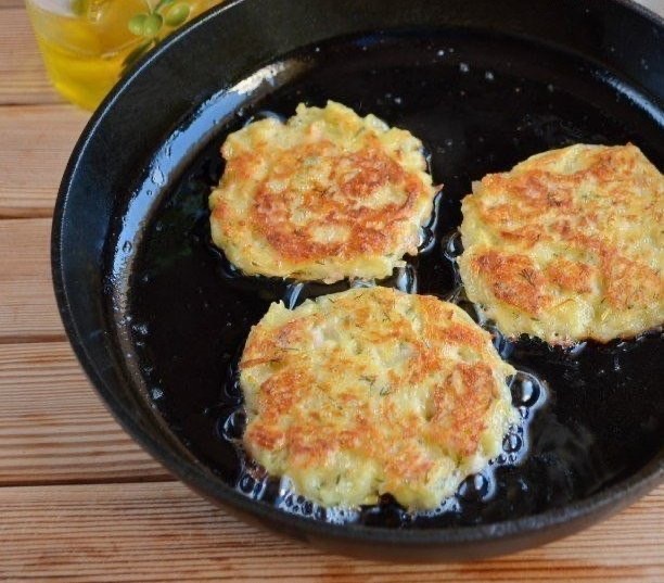 5. В горячее масло ложкой выкладывайте картофельную массу, жарьте на среднем огне до золотистой корочки.